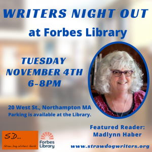 Join Straw Dog Writers Guild on Tuesday November 4th, 6:00-8:00pm for Writers Night Out with featured writer Madlynn Haber at Forbes Library. No registration required. If you want to participate in Open Mic and read, please sign up by 5:50pm. Ten names will be randomly selected. Each reader will have five minutes. The second half of the evening showcases our Featured Reader.