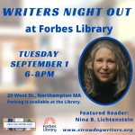 Join Straw Dog Writers Guild on Tuesday September 1st, 6:00-8:00pm for Writers Night Out with featured writer Nina B. Lichtenstein, at Forbes Library. No registration required. If you want to participate in Open Mic and read, please sign up by 5:50pm. Ten names will be randomly selected. Each reader will have five minutes. The second half of the evening showcases our Featured Reader.