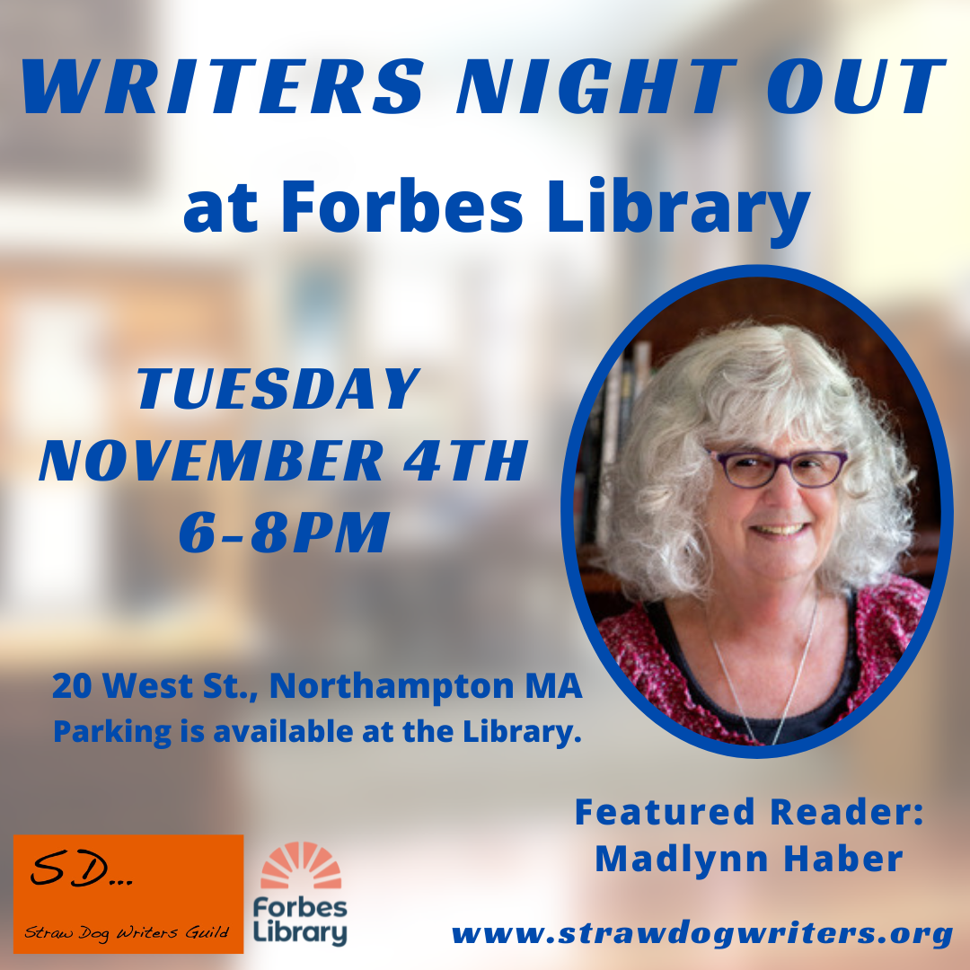 Forbes Library Coolidge Museum, 20 West Street, Northampton, 01060Join Straw Dog Writers Guild on Tuesday November 4th, 6:00-8:00pm for Writers Night Out with featured writer Madlynn Haber at Forbes Library. No registration required. If you want to participate in Open Mic and read, please sign up by 5:50pm. Ten names will be randomly selected. Each reader will have five minutes. The second half of Read More