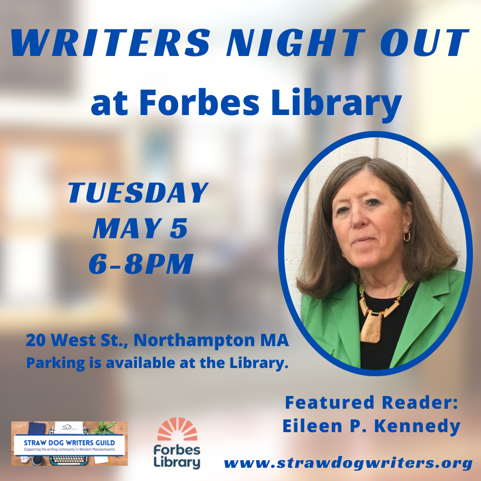Forbes Library Coolidge Museum, 20 West Street, Northampton, 01060Join Straw Dog Writers Guild on Tuesday May 5th, 6:00-8:00pm for Writers Night Out with featured writer Eileen P. Kennedy, at Forbes Library. No registration required. If you want to participate in Open Mic and read, please sign up by 5:50pm. Ten names will be randomly selected. Each reader will have five minutes. The second half Read More