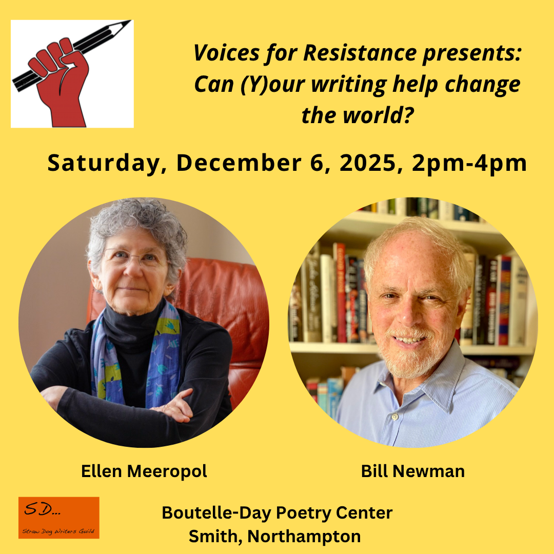 Boutelle-Day Poetry Center College Lane, Northampton, MA, United StatesVoices for Resistance: Can (Y)our writing help change the world? A reading and conversation with Ellen Meeropol and Bill Newman In times of political and social turmoil, many writers struggle Read More