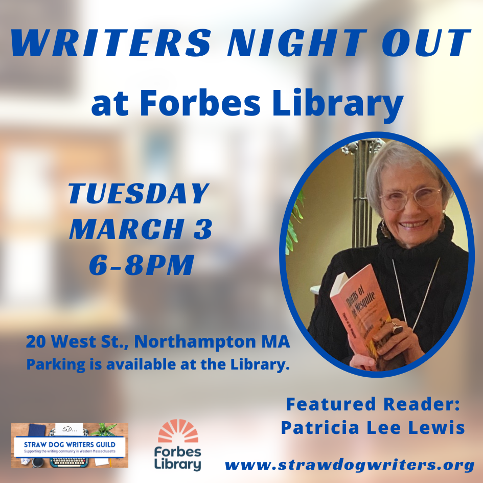 Forbes Library Coolidge Museum, 20 West Street, Northampton, 01060Join Straw Dog Writers Guild on Tuesday March 3rd, 6:00-8:00pm for Writers Night Out with featured writer Patricia Lee Lewis, at Forbes Library. No registration required. If you want to participate Read More