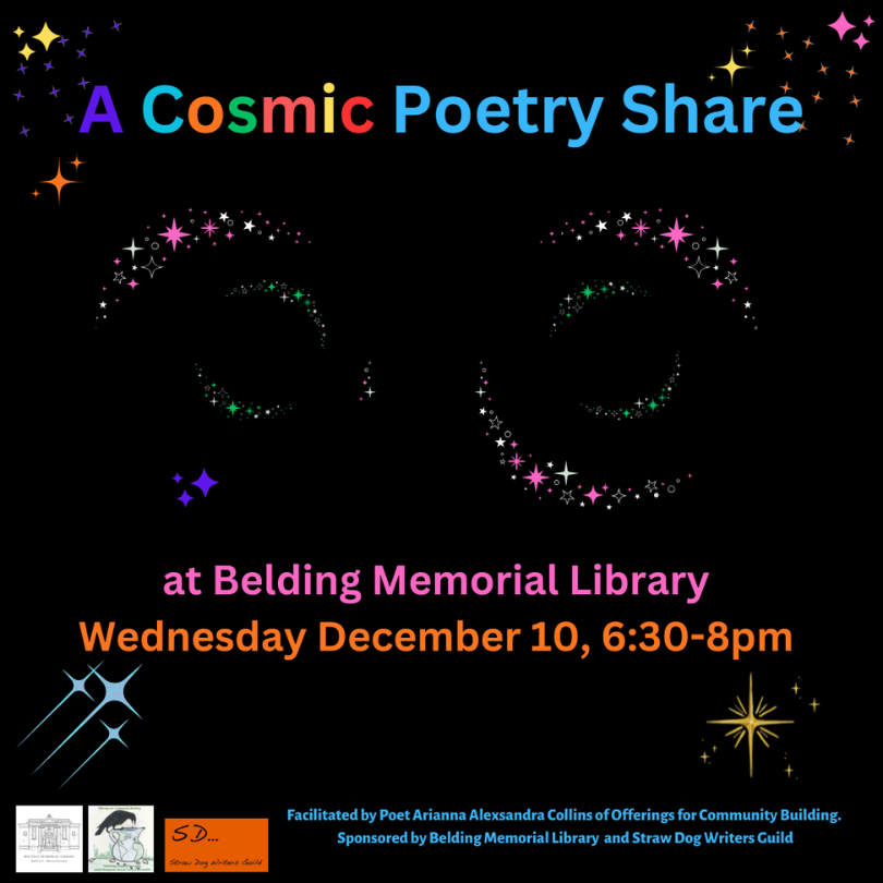 Belding Memorial Library 344 Main Street, Ashfield, United StatesGroovy! Whether you’ve got poems about stars, planets, cosmic adventures, out of this world encounters, or out of body experiences, we want to hear them! (And you don't have any of your own, find and read someone else's poetry.) Come read and listen on Wednesday, December 10 from 6:30-8:00pm in the Belding Memorial Library Meeting