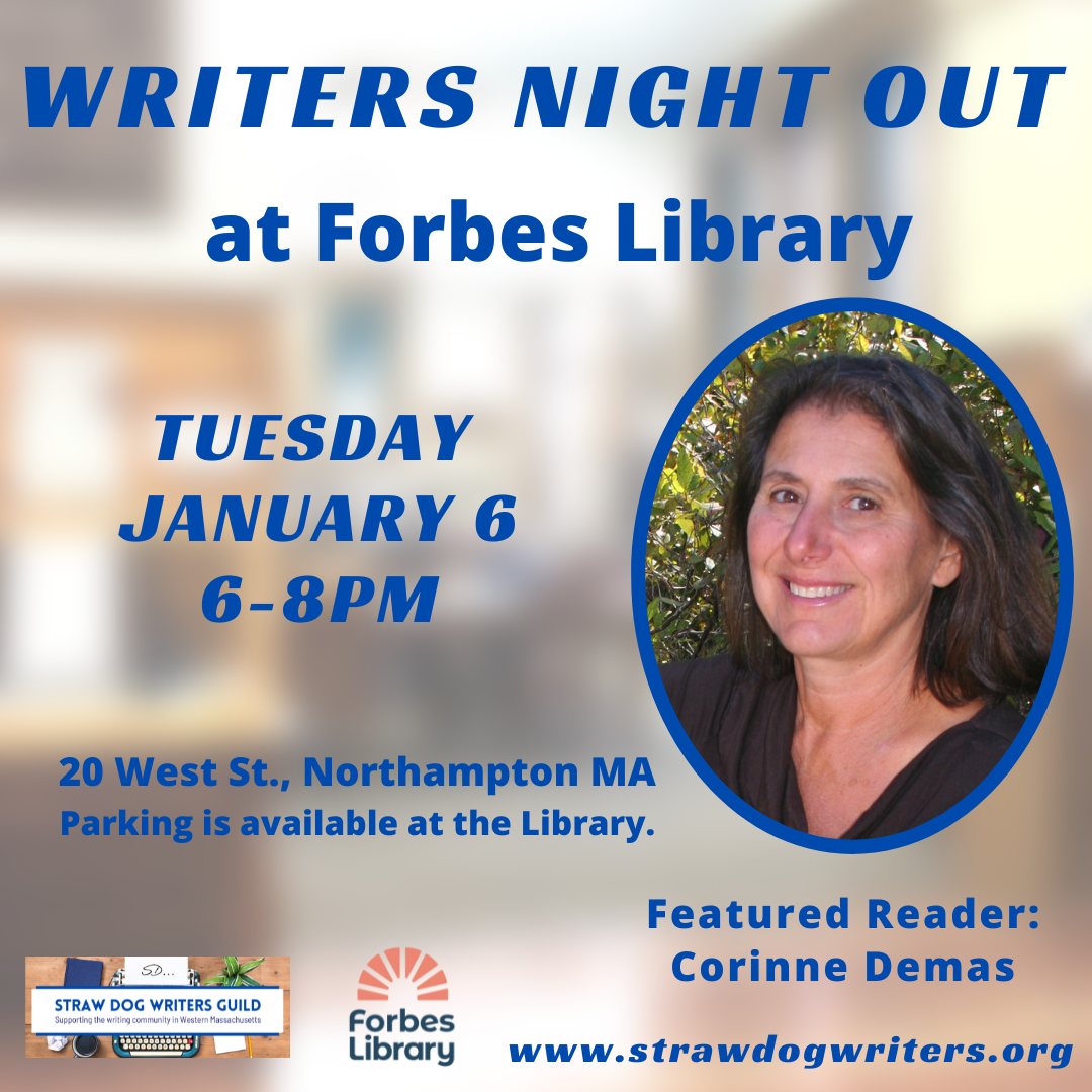 Forbes Library Coolidge Museum, 20 West Street, Northampton, 01060Join Straw Dog Writers Guild on Tuesday January 6th, 6:00-8:00pm for Writers Night Out with featured writer Corinne Demas, at Forbes Library. No registration required. If you want to participate in Open Mic and read, please sign up by 5:50pm. Ten names will be randomly selected. Each reader will have five minutes. The second half of